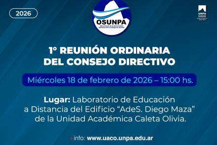 Desde la Obra Social de la Universidad Nacional de la Patagonia Austral (OSUNPA) se informa que el próximo miércoles 18 de febrero de 2026 y a las 15:00 horas, se llevará a cabo la 1° Reunión Ordinaria del Consejo Directivo.