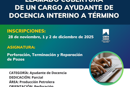 Más información en: https://www.uaco.unpa.edu.ar/274-ayudante-de-docencia-dedicacion-parcial-area-produccion-petrolera