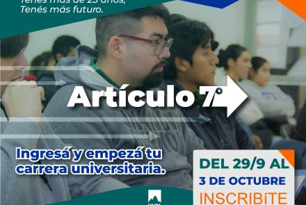 Hasta el viernes 3 de octubre permanecerá abierta la inscripción para personas mayores de 25 años que deseen ingresar a la Universidad Nacional de la Patagonia Austral por la vía excepcional del Artículo Séptimo de la Ley de Educación Superior. La convocatoria se encuentra dirigida a quienes no hayan finalizado el nivel medio, pero puedan demostrar conocimientos, aptitudes o experiencia laboral vinculada a la carrera que desean cursar.