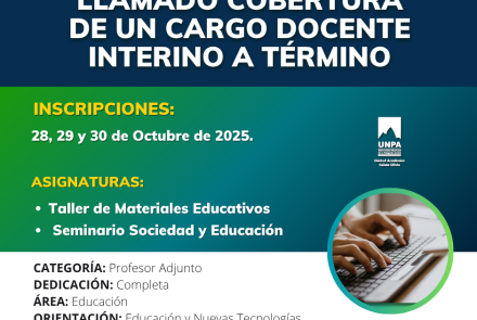 La Unidad Académica Caleta Olivia de la Universidad Nacional de la Patagonia Austral informa la apertura de la convocatoria para cubrir un cargo docente interino de Profesor Adjunto con dedicación completa en el área Educación, con orientación en Educación y Nuevas Tecnologías.