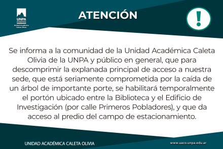 Se informa a la comunidad de la Unidad Académica Caleta Olivia de la UNPA y público en general, que para descomprimir la explanada principal de acceso a nuestra sede, que está seriamente comprometida por la caída de un árbol de importante porte, se habilitará temporalmente el portón ubicado entre la Biblioteca y el Edificio de Investigación (por calle Primeros Pobladores), y que da acceso al predio del campo de estacionamiento.