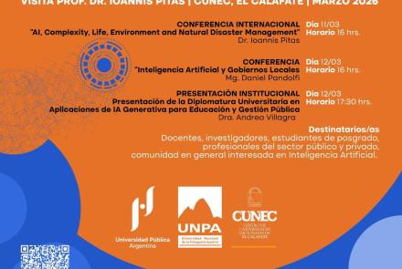 La Universidad Nacional de la Patagonia Austral (UNPA) informó que los días 11 y 12 de marzo se desarrollará en el Centro de Universidades Nacionales de El Calafate (CUNEC) un programa de actividades académicas vinculado a la inteligencia artificial, organizado por la International Artificial Intelligence Doctoral Academy (AIDA) y la Diplomatura Universitaria de Extensión en Aplicaciones de Inteligencia Artificial Generativa para Educación y Gestión Pública, que comenzará a dictarse en abril desde la Unidad Académica Caleta Olivia.