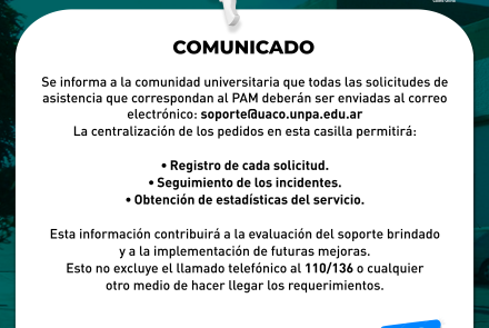 Con el objetivo de mejorar la organización y eficiencia del servicio, se informa a la comunidad universitaria que todas las solicitudes de asistencia correspondientes al Programa de Política Ambiental (PAM) deberán enviarse al correo electrónico: