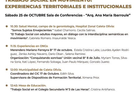 Las exposiciones comenzarán a las 10.30 con la Mesa de Salud Mental, dedicada al campo de la gerontología en el Hospital Zonal de Caleta Olivia. Allí se compartirán los trabajos “Somos Sujetos Envejecientes”, a cargo de Isabel Chamorro y Cecilia Salinas, y “El Trabajo Social con adultos mayores, en diálogo con la interdisciplina: semánticas en movimiento”, de Gabriela Romero y Yesica Insaurralde.